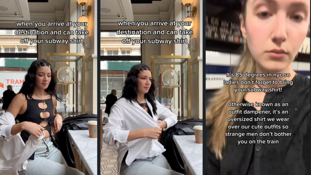 An oversized, shapeless shirt one slips over her “real” outfit, the subway shirt—also referred to as an “outfit dampener”—hides the contours of one’s body from neck to thighs, shielding from view the skimpy outfit beneath. And, because this is the age of TikTok, a few women shared their genius trick with other women on social media. The cover-up went viral.