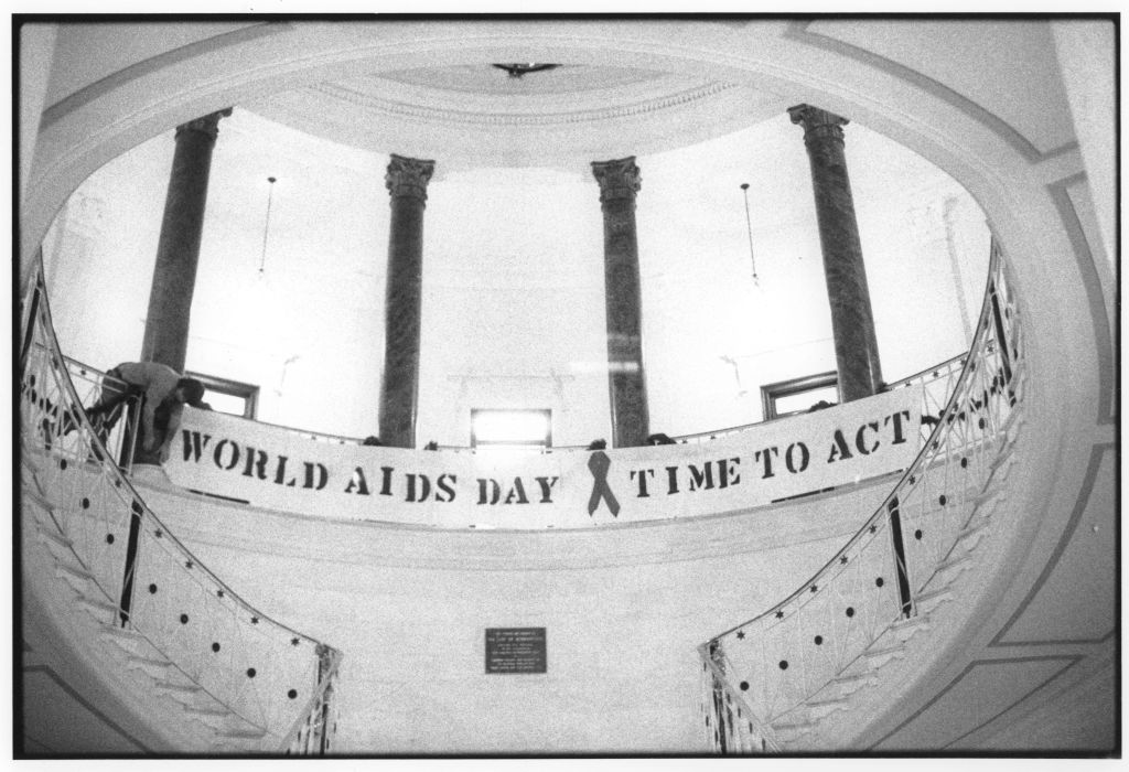 A banner on display Dec. 1, 1995, in the rotunda of City Hall in Schenectady, N.Y. (Thomas McGovern / Getty Images)