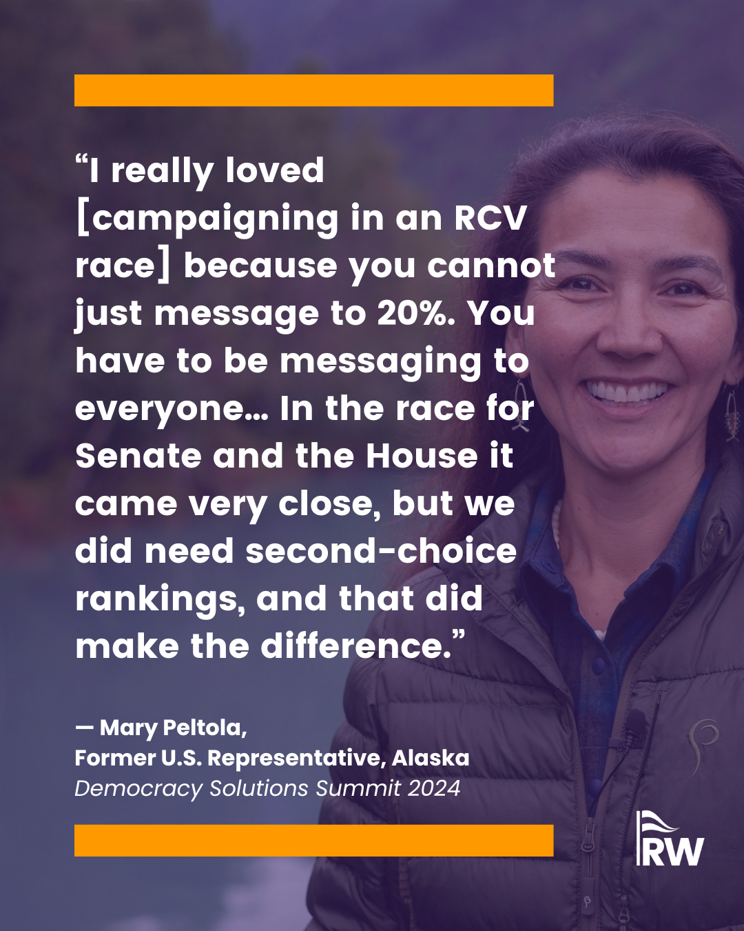 Former Rep. Mary Peltola is running for U.S. Senate in Alaska, and polls show she has a strong chance of winning in November. She is one of the nation’s great champions of ranked-choice voting and has participated in RepresentWomen events, discussing Alaska’s unique electoral system, which has contributed to women now making up half of Alaska’s House of Representatives.