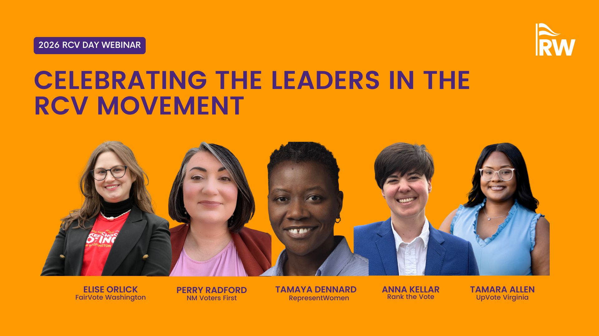 This week, we were pleased to host an engaging RCV Day webinar with incredible panelists from across the country, who reaffirmed our research within their lived experiences driving this work. RepresentWomen’s communications lead, Alana Persson, moderated this panel and was joined by our guests—Anna Kellar of Rank the Vote, Elise Orlick of FairVote Washington, Tamara Allen of UpVote Virginia, Perry Radford of NM Voters First and Tamaya Dennard of RepresentWomen. The conversation was thoughtful, energizing and deeply rooted in what it takes to build durable reform. Our entire team left inspired by the insight, care and passion each panelist brought to the discussion.